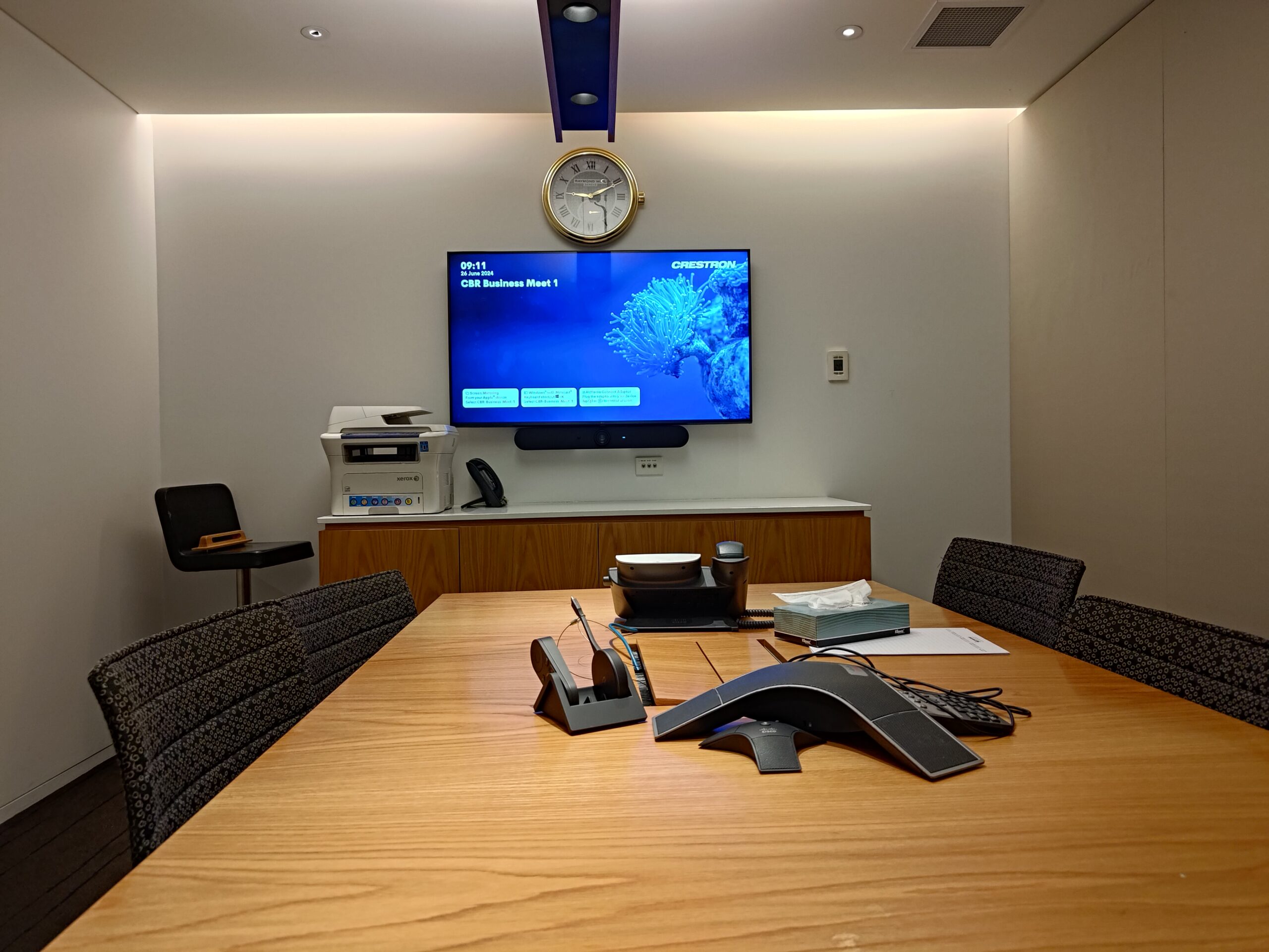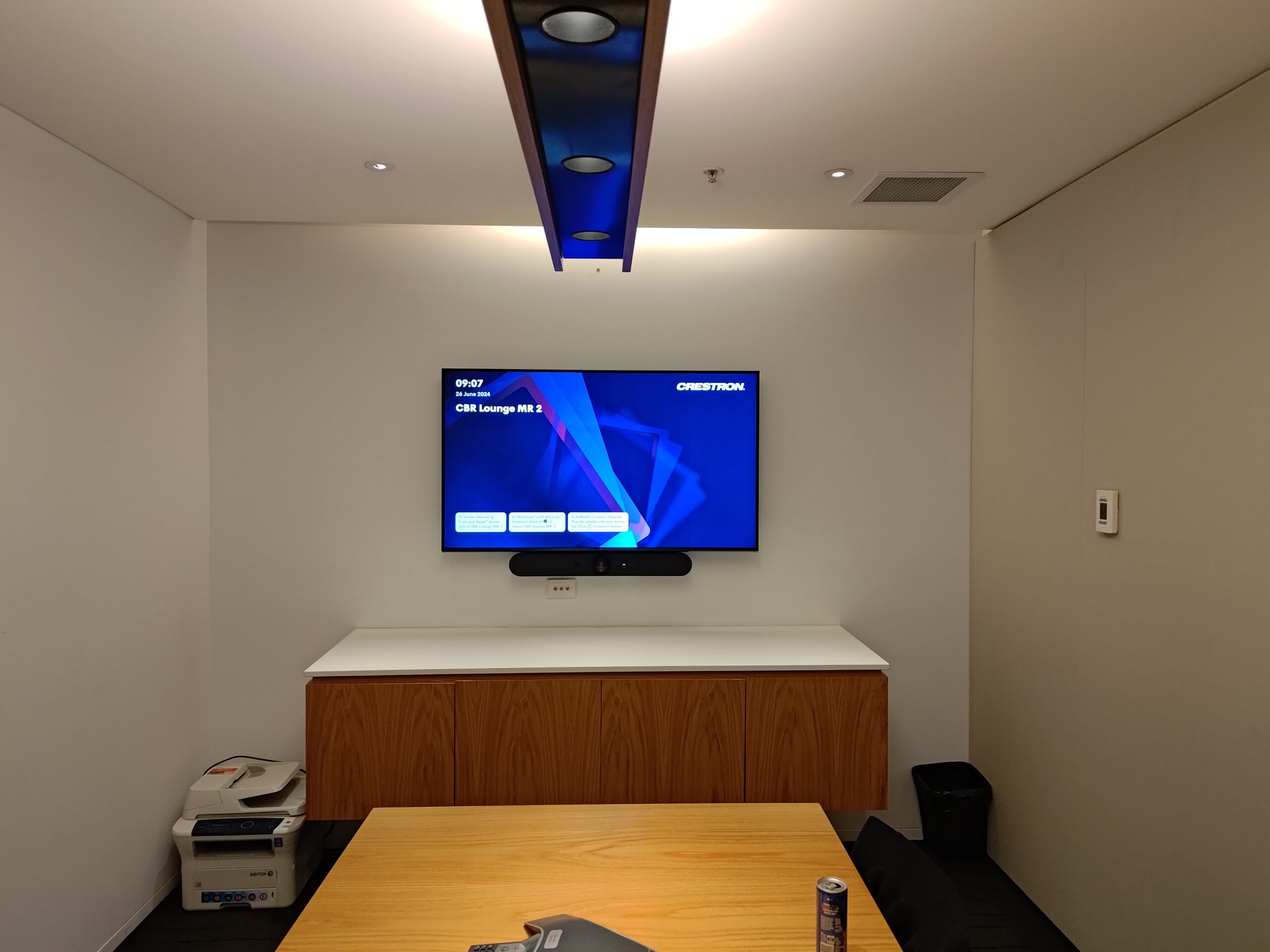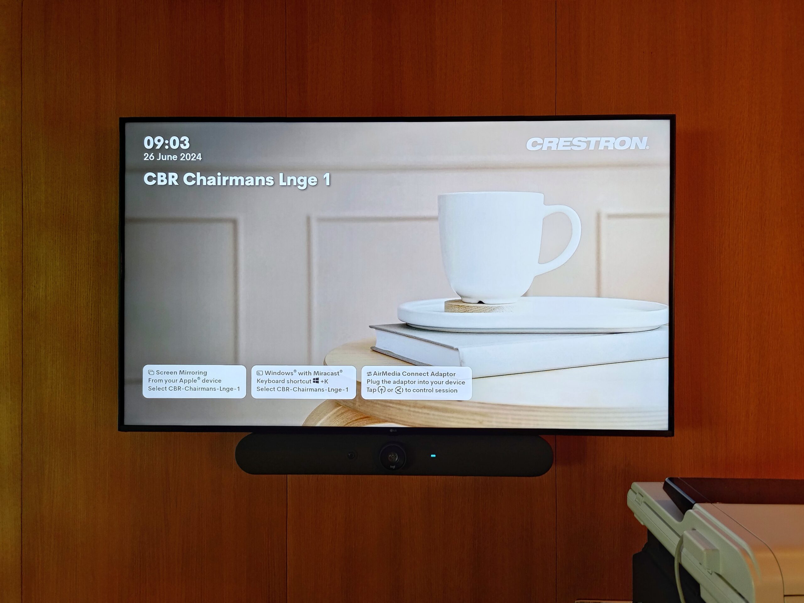 Mounting of new displays, installation of Logitech Rally Bar Mini and Crestron Airmedia wireless presentation system.
